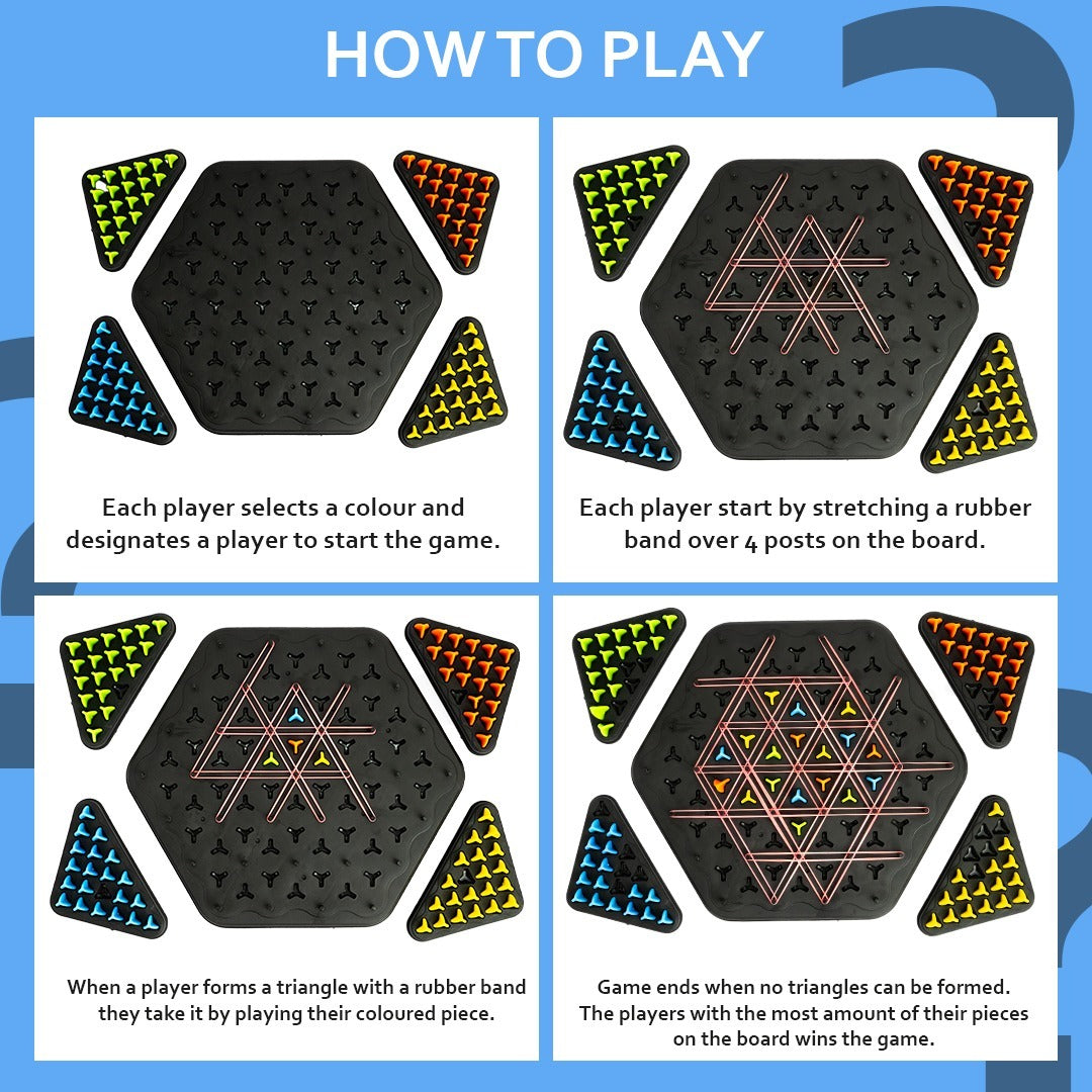 🔹1N Game Board, 4N Triangle Token Tray, 84N Tokens in 4 Colours, 50N Elastic Rubber Band.